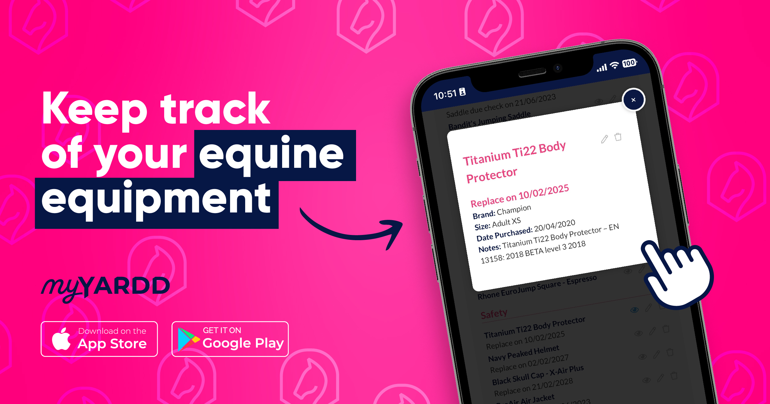 Riding helmets should be replaced after 3-5 years due to natural wear and tear on the materials. Check individual manufacturers for their official guidance on their riding hats. Of course, if you have a fall it is recommended that you replace your riding hat no matter how old. In myYardd, you can create a digital tack room to record the purchase dates of items and set reminders, so you know when they are due to be replaced.