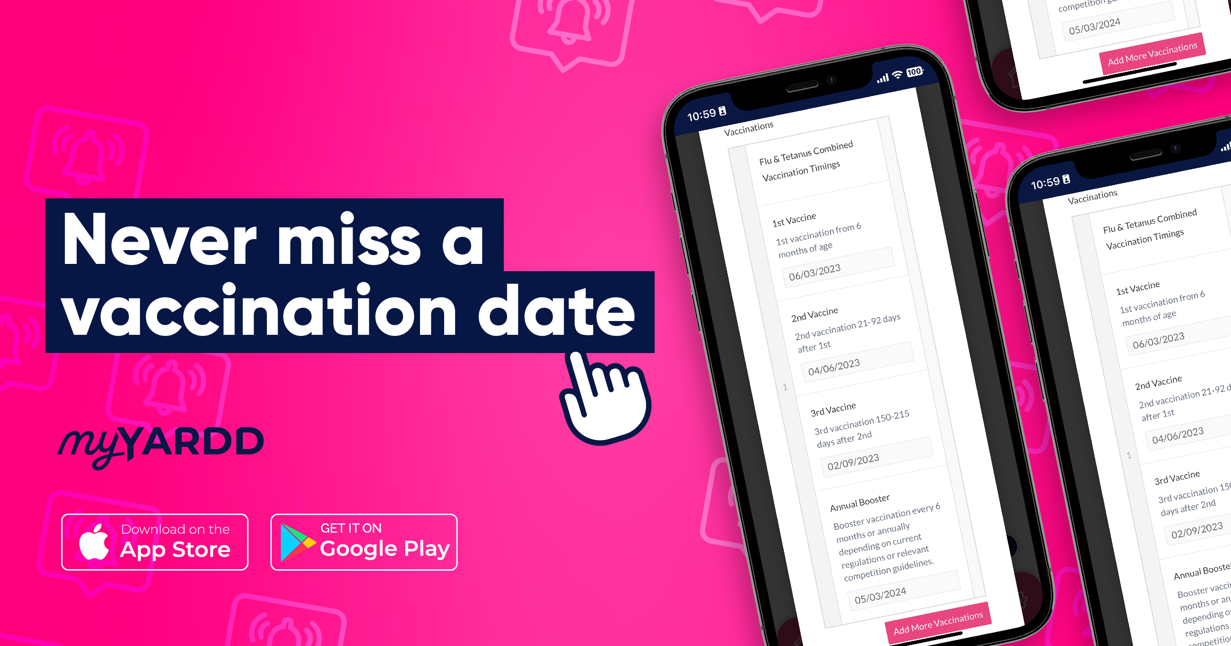 Within the vet section of each of your horse’s profiles in myYardd, you can add all your vaccination dates. These link to your myYardd calendar as handy reminders. Missing vaccinations and having to restart can be costly and inconvenient.